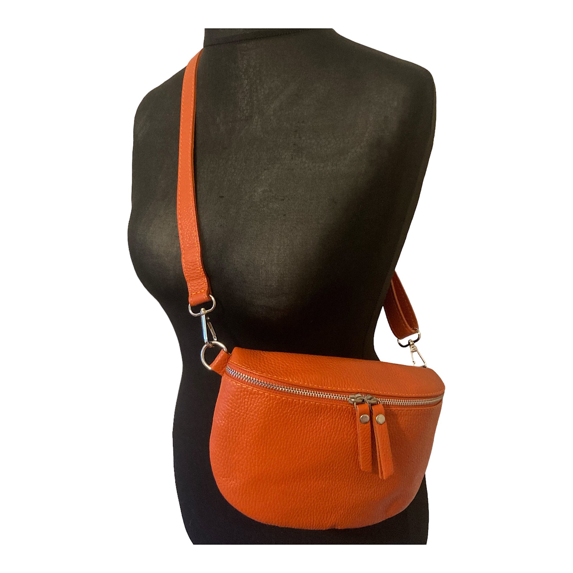 Beautiful burnt orange Italian leather cross body bag which can also be worn around the waist as a bumbag. Lovely versatile design with a double zipper, practical inside pocket and plenty of space for all your essentials. Strap is fully adjustable and detachable.