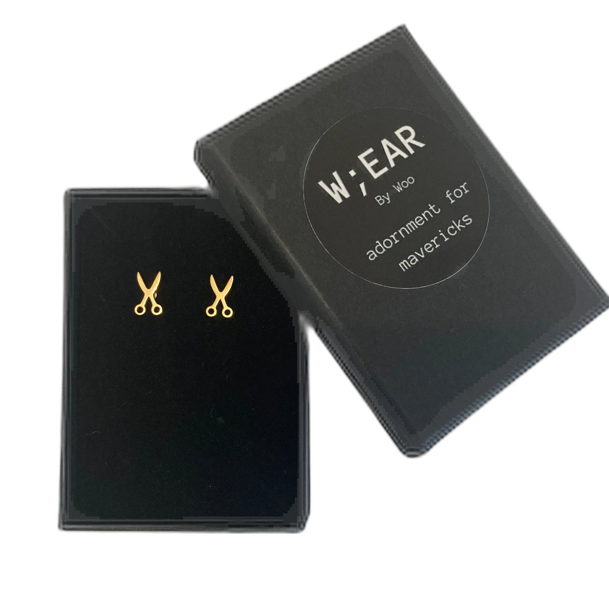 Stainless steel scissor studs, available in gold or silver, presented in an eco friendly gift box.