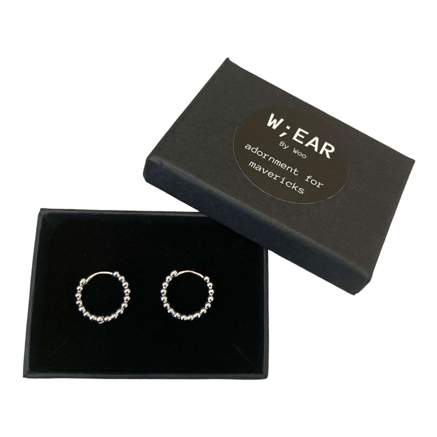 Stainless steel bobble huggy hoops, presented in an eco-friendly gift box.
