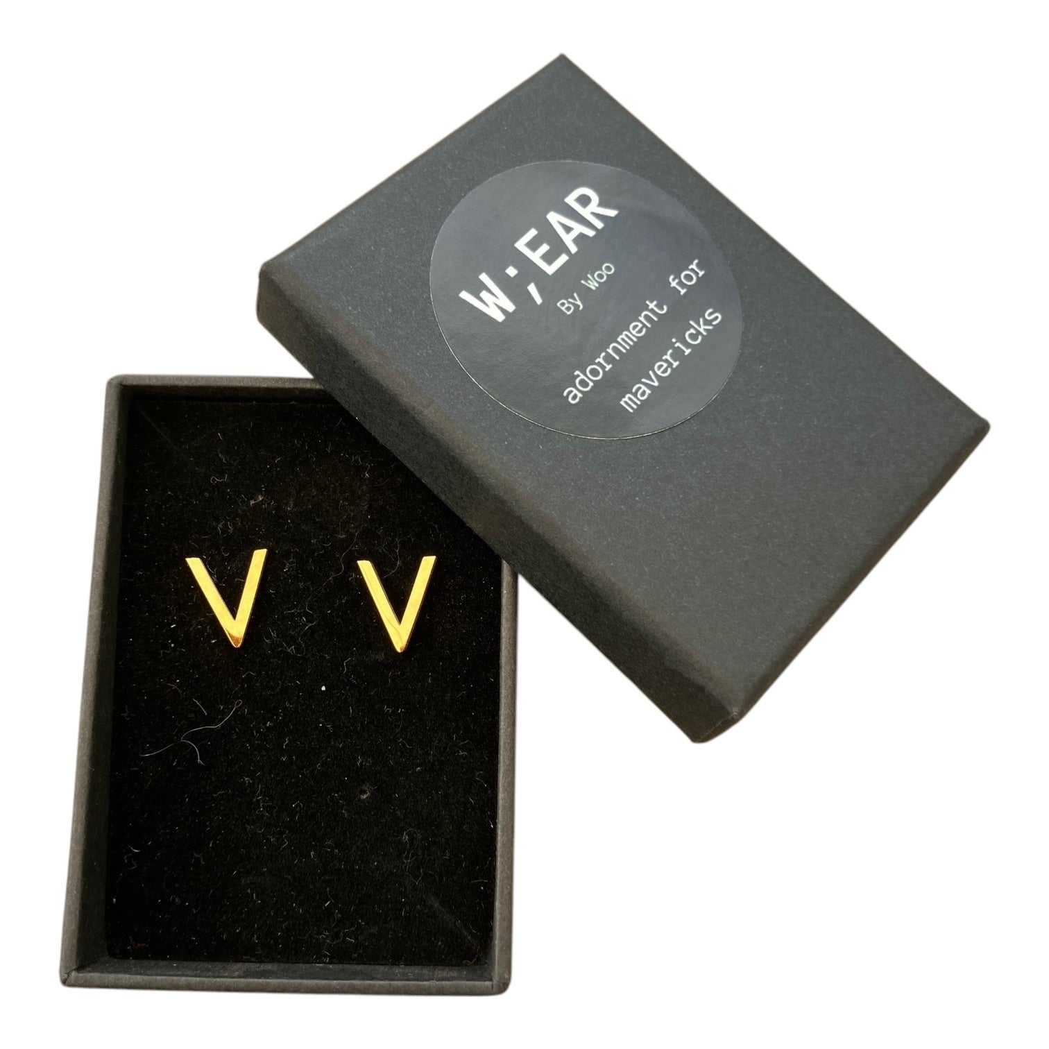 Stainless steel vee studs available in gold or silver, presented in an eco-friendly gift box.