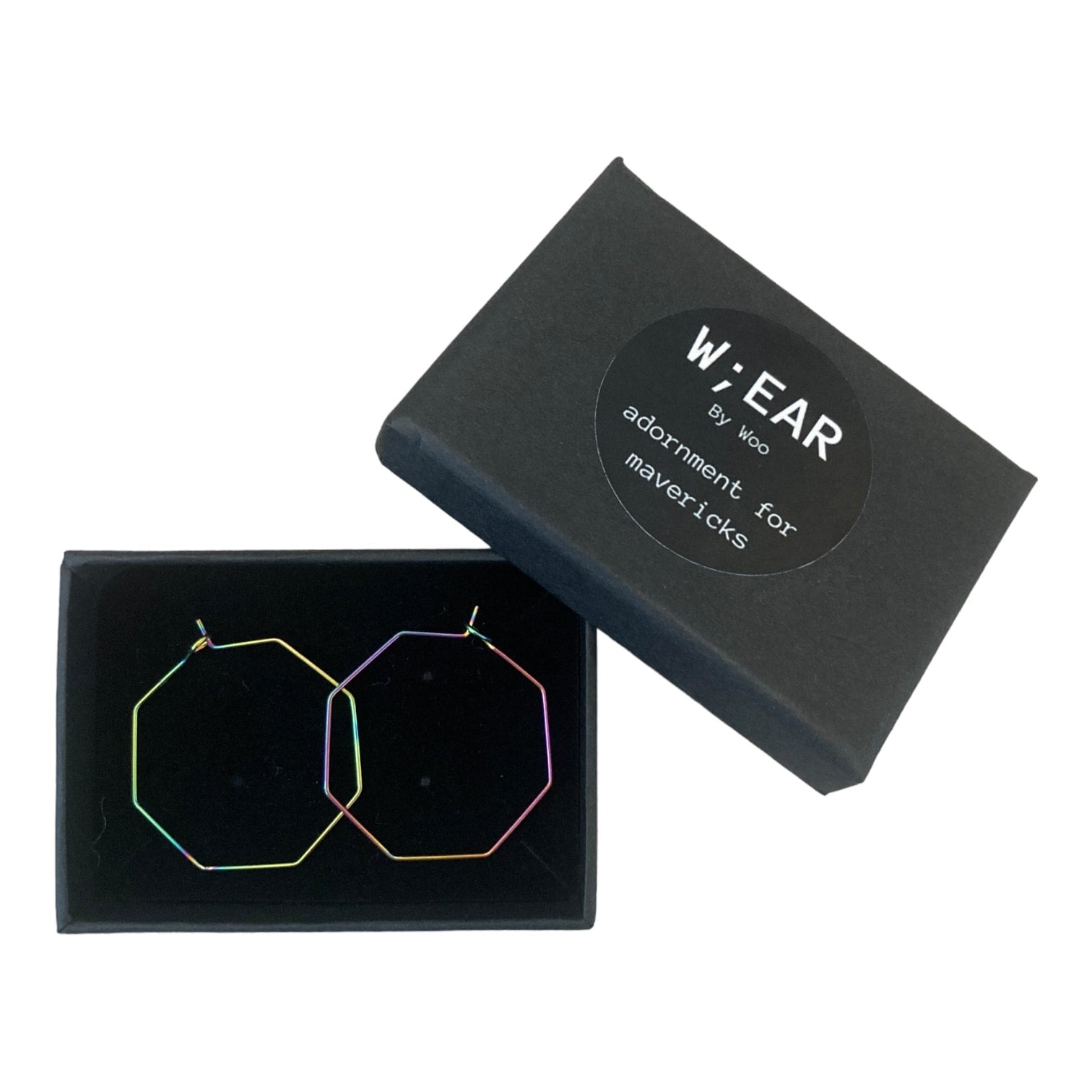 Wire rainbow octagon earrings presented in an eco-friendly gift box.